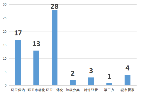 從中標(biāo)情況來看,環(huán)衛(wèi)一體化項(xiàng)目達(dá)到28個(gè),占總項(xiàng)目的41%;環(huán)衛(wèi)保潔、道路保潔等17個(gè),占比25%;環(huán)衛(wèi)市場化項(xiàng)目13個(gè),占比19%,三類服務(wù)模式占比超過85%。