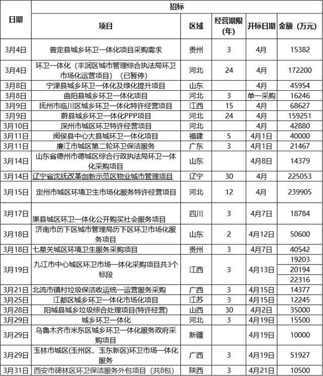 一季度末尾給二季度開了一個(gè)好彩頭,雖然3月份只開標(biāo)了18個(gè)億級環(huán)衛(wèi)項(xiàng)目,但卻有23個(gè)過億項(xiàng)目開始招標(biāo),而且這些項(xiàng)目均在4月份開標(biāo),總投資達(dá)138億!這也意味著第二季度首月已有百億項(xiàng)目將被收入囊中。
