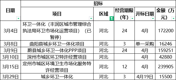 河北環(huán)衛(wèi)市場最瘋狂的并不是已開標(biāo)的項(xiàng)目,而是剛剛釋放到市場的6個(gè)億級招標(biāo)項(xiàng)目,總投資達(dá)65億。其中,僅僅15天時(shí)間就釋放了3個(gè)10億級項(xiàng)目(其中“豐潤區(qū)城市管理綜合執(zhí)法局環(huán)衛(wèi)市場化運(yùn)營項(xiàng)目”已暫停后延,后續(xù)情況,中國固廢網(wǎng)將持續(xù)關(guān)注)。河北一季度億級環(huán)衛(wèi)市場總規(guī)模接近79億,加上千萬級項(xiàng)目,河北一季度環(huán)衛(wèi)市場總規(guī)模將超過80億元,迎來大爆發(fā)!