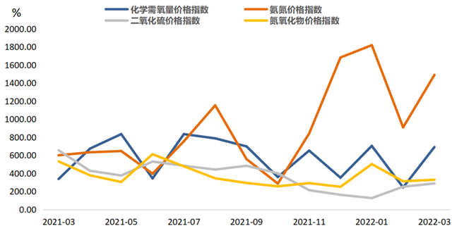 從四項(xiàng)排污權(quán)交易環(huán)比情況看,指數(shù)均呈上行走勢(shì),化學(xué)需氧量、氨氮、二氧化硫和氮氧化物環(huán)比分別上漲182.82%、63.85%、14.44%和5.52%;與上年同期相比,呈現(xiàn)“兩漲兩跌”走勢(shì),其中,化學(xué)需氧量、氨氮同比分別上漲104.95%、148.37%,二氧化硫、氮氧化物同比分別下跌56.02%、38.18%。