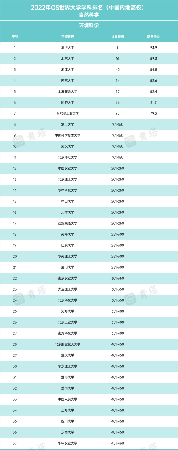 范圍縮小到內(nèi)地高校,按照2022年QS世界大學(xué)學(xué)科排名,中國(guó)內(nèi)地高校環(huán)境科學(xué)學(xué)科排名如下: