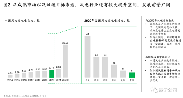 相比之下,當(dāng)前風(fēng)電的體量還相對較小——2021年中國風(fēng)力發(fā)電量占比僅為6.99%,雙碳政策要求風(fēng)力發(fā)電量占比在2030年達(dá)到26%的目標(biāo)。國際上不少國家的風(fēng)力發(fā)電占比已經(jīng)很高,例如丹麥風(fēng)力發(fā)電量占比達(dá)到了48%,英國、德國也都超過了20%(見圖2)。