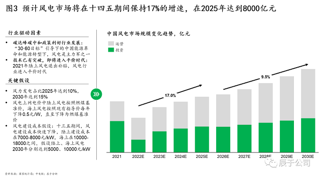 在政策和技術(shù)兩大因素的驅(qū)動下,辰于預(yù)測我國風(fēng)電市場整體將在十四五期間保持17%的增速,在2025年達(dá)到8000億元,在2030年突破12000億元(包括投資和運(yùn)營,見圖3),市場規(guī)模達(dá)到萬億只是未來10年間的事情。