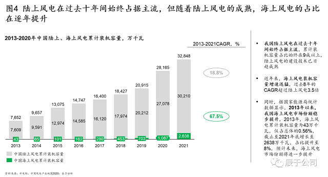 從裝機(jī)容量來看,我國陸上風(fēng)電在過去十年始終占據(jù)主流,累計(jì)裝機(jī)容量占比一直保持在9成以上,截至2021年,中國陸上風(fēng)電累計(jì)裝機(jī)容量為3.02億千瓦,海上風(fēng)電為0.26億千瓦,陸上風(fēng)電累計(jì)裝機(jī)容量超過海上風(fēng)電的十倍(見圖4)。