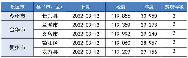 浙江省生態(tài)環(huán)境監(jiān)測中心基于TERRA/MODIS(上午)和AQUA/MODIS(下午)衛(wèi)星遙感數據,2022年3月,共監(jiān)測到秸稈焚燒火點5個(不包括云覆蓋下的火點信息),同比減少1個,所屬轄區(qū)為湖州市、金華市和衢州市,其余設區(qū)市未監(jiān)測到火點。