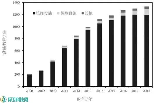 2018年全國縣級行政區(qū)域的無害化處理設(shè)施1324座,其中填埋設(shè)施1196座,2018年
