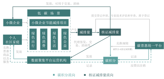 目前碳排放權(quán)交易市場主要針對高耗能、高排放的企業(yè)進行生產(chǎn)端的強制性排放控制,對個人消費端的低碳減排則通過碳普惠機制實現(xiàn)。與控排企業(yè)集中的點源排放不同,個人和小微企業(yè)的碳排放具有“量小、分散、面廣”的特點,為此設(shè)計碳普惠機制針對個人和小微企業(yè)的減排。根據(jù)《廣東省碳普惠交易管理辦法》對碳普惠的定義,碳普惠機制是指運用相關(guān)商業(yè)激勵、政策鼓勵和交易機制,帶動社會廣泛參與碳減排工作,促使控制溫室氣體排放及增加碳匯的行為。該機制的核心是通過將公眾的低碳行為產(chǎn)生的減碳量轉(zhuǎn)化為相應(yīng)的碳積分,利用碳積分換取商業(yè)優(yōu)惠券或兌換服務(wù)等方式促進公眾進一步減排,形成全社會減排的良好氛圍和生活方式,甚至轉(zhuǎn)變政府治理和社會運轉(zhuǎn)模式。