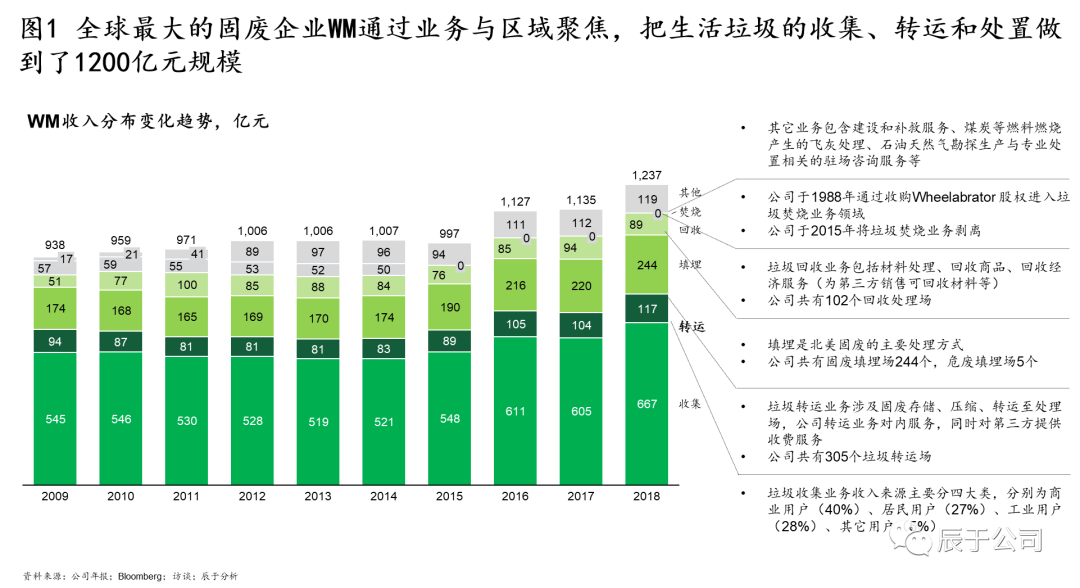 美國WM的50年發(fā)展幾乎就是一個并購史,可分為四個階段(見圖4):1968~1984年全面鋪開階段,通過收購全美各地的小型垃圾收運公司提升市場地位,其中1972 年就進行了133 次收購,1984年收購北美廢物管理公司SCA之后,成為全美第一大垃圾運轉(zhuǎn)商;1988~1990年三輪驅(qū)動階段,確立了垃圾收集轉(zhuǎn)運、焚燒、回收利用“三輪驅(qū)動”的發(fā)展方式,通過并購垃圾焚燒能源公司W(wǎng)heelabrator和紙類回收運營商Stone Container等手段實現(xiàn);1993~1997年多元發(fā)展階段,WM意圖通過大舉并購開拓多元化市場,通過收購先后進入危廢、石棉移除、金屬腐蝕處理、草坪養(yǎng)護等市場,股價從1993年初的8.87美元上漲至1997年初的18.86 美元,漲幅達112%(不過事后證明這個階段的過度多元化并購是失敗的);1999年以后WM開始專注在核心業(yè)務+專業(yè)化新生業(yè)務的并購,其中核心業(yè)務收購了BFI(全美第二大固廢公司)在加拿大的全部業(yè)務和全美最大固廢第三方服務網(wǎng)絡運營商Oak Leaf Global Holdings,這些并購不僅鞏固了WM傳統(tǒng)市場的領(lǐng)先地 U7Y位,也完善了固廢處理全產(chǎn)業(yè)鏈布局。