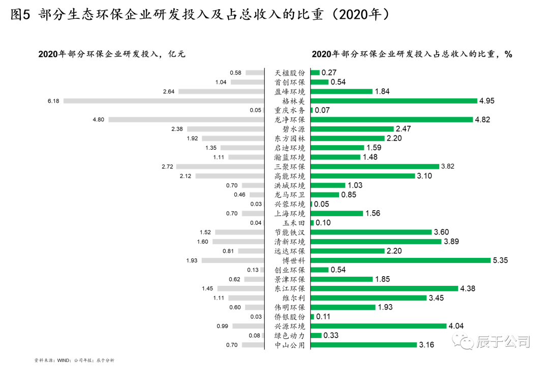 不得不說,大部分生態(tài)環(huán)保企業(yè)并不重視技術(shù)創(chuàng)新投入。對國內(nèi)環(huán)保上市企業(yè)的統(tǒng)計發(fā)現(xiàn),很多企業(yè)每年的研發(fā)投入不足2億元,占收入的比重不足3%(見圖5)。即使全球巨頭蘇伊士環(huán)境,每年研發(fā)投入近1億歐元,占其收入的比重不足1%。