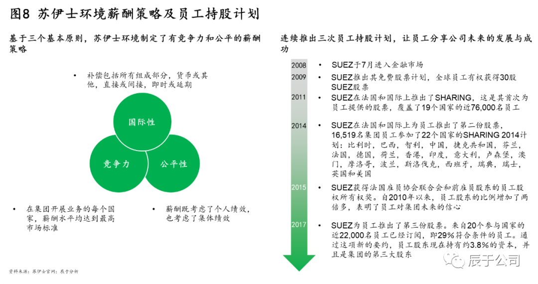 在員工保留方面,蘇伊士通過實施長短結(jié)合的薪酬政策吸引和激勵員工,并持續(xù)推出員工持股計劃讓員工分享公司的發(fā)展與成功。一方面,蘇伊士基于國際性、競爭性和公平性三個原則制定薪酬策略,確保薪酬政策符合當?shù)厥袌鲆?,同時也確保薪酬水平在當?shù)靥幱谳^高水平;另一方面,蘇伊士自2009年開始連續(xù)推出三次員工持股計劃,截至2017年底,員工股東持有約3.8%的股權(quán),并且是集團的第三大股東(如圖8)。