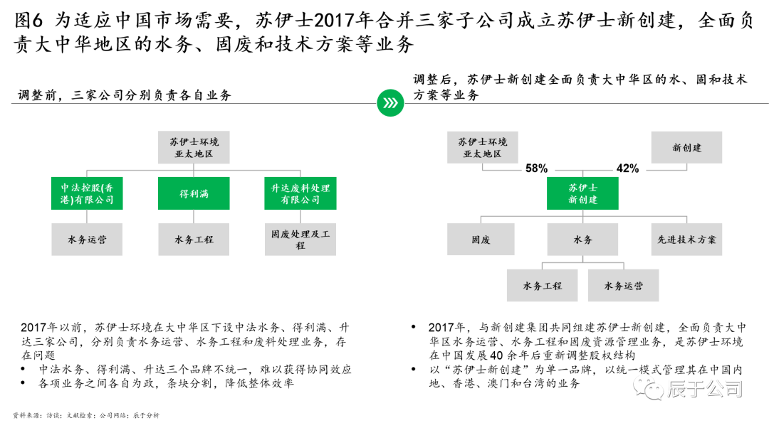 蘇伊士中國也在2017年對其組織架構(gòu)進行了優(yōu)化。2017年以前,蘇伊士在大中華區(qū)下設中法水務、得利滿、升達三家公司,分別負責水務運營、水務工程和固廢廢物處理業(yè)務,由于三個品牌不統(tǒng)一、難以獲得協(xié)同效應,各業(yè)務之間各自為政、條塊分割,降低了整體效率。對此,2017年蘇伊士與新創(chuàng)建集團共同組建蘇伊士新創(chuàng)建,全面負責公司在大中華地區(qū)的水務運營、水務工程和固廢資源管理業(yè)務,這是蘇伊士在中國發(fā)展 40 余年后重新調(diào)整股權(quán)結(jié)構(gòu),同時以“蘇伊士新創(chuàng)建”為單一品牌,以統(tǒng)一模式管理其在中國內(nèi)地、香港、澳門和臺灣的業(yè)務(見圖6)。2021年初對蘇伊士新創(chuàng)建和蘇渝兩家公司的股權(quán)收購則進一步強化了組織合力。