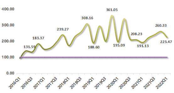 浙江省排污權(quán)交易活躍度呈上下波動(dòng)走勢(shì)。2022年第一季度,浙江省排污權(quán)交易活躍度指數(shù)為223.47點(diǎn),環(huán)比下行14.16%,同比上行16.92%。