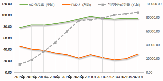 從環(huán)境改善情況來看,水污染物成交量(由化學(xué)需氧量和氨氮成交量構(gòu)成)與III類水質(zhì)以上省控?cái)嗝姹壤矢叨日嚓P(guān)關(guān)系,顯著性水平小于0.01,皮爾遜相關(guān)系數(shù)為0.964。氣污染物成交量(由二氧化硫和氮氧化物成交量構(gòu)成)與浙江省AQI優(yōu)良率呈高度正相關(guān)關(guān)系,顯著性水平小于0.01,皮爾遜相關(guān)系數(shù)為0.955;氣污染物成交量與PM2.5指數(shù)呈高度負(fù)相關(guān)關(guān)系,顯著性水平小于0.01,皮爾遜相關(guān)系數(shù)為-0.909。