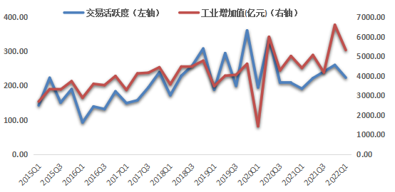 從工業(yè)經(jīng)濟(jì)指標(biāo)來看,浙江省排污權(quán)交易活躍度與工業(yè)增加值(采用浙江省規(guī)模以上工業(yè)增加值各季度增加值,非累計(jì)計(jì)算數(shù))整體也呈中度正相關(guān)走勢(shì),顯著性水平小于0.01,皮爾遜相關(guān)系數(shù)為0.605。