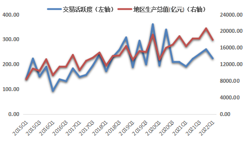 浙江省排污權(quán)交易活躍度與地區(qū)生產(chǎn)總值(采用浙江省地區(qū)生產(chǎn)總值各季度增加值,非累計(jì)計(jì)算數(shù))整體呈中度正相關(guān)走勢(shì),顯著性水平小于0.01,皮爾遜相關(guān)系數(shù)為0.695。