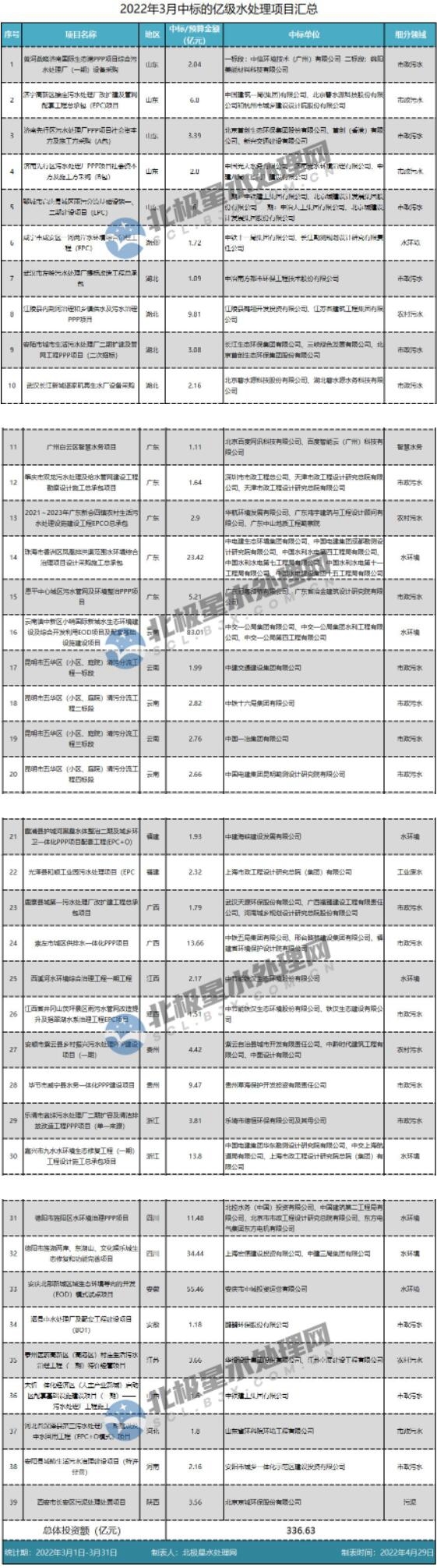 據(jù)統(tǒng)計(jì),2022年3月開標(biāo)億級(jí)水處理項(xiàng)目39個(gè)(含部分預(yù)中標(biāo),不含上個(gè)月已統(tǒng)計(jì)的預(yù)中標(biāo),不含供水),涉及16大省份,總投資額336.63億元。