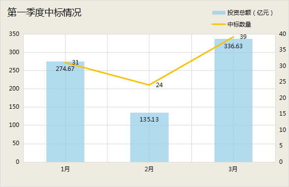 第一季度,開標(biāo)的億級(jí)水處理項(xiàng)目共94個(gè),涉及總投資746億元,其中3月份的勢(shì)頭最盛。