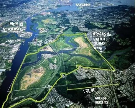 弗萊士河垃圾填埋場(chǎng)位于紐約斯塔滕島(圖3),占地面積超過(guò)2200英畝(約8.9k㎡),于1948年投入運(yùn)營(yíng),2001年停止接收垃圾。這里曾經(jīng)是世界上最大的垃圾填埋場(chǎng),也是1990年代紐約市唯一仍在使用的填埋場(chǎng)。隨著1999年弗萊士河更新計(jì)劃的啟動(dòng),原有填埋場(chǎng)區(qū)陸續(xù)關(guān)閉并封場(chǎng),直至2001年,填埋場(chǎng)接收了最后一批垃圾——“9?11”事件的世貿(mào)中心建筑廢墟。
