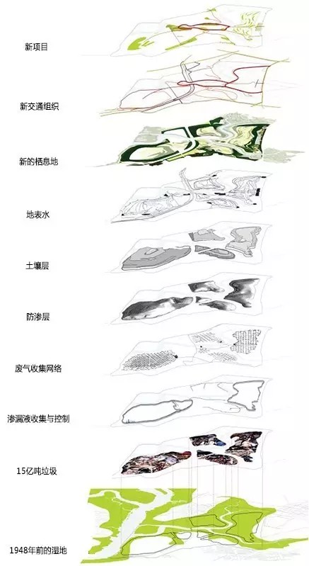 環(huán)境修復(fù)與垃圾防滲是弗萊士河公園改造初期的關(guān)鍵任務(wù),其中運(yùn)用了多層覆蓋技術(shù),收集廢棄物產(chǎn)生的氣體、滲漏液的系統(tǒng)和水質(zhì)檢測(cè)系統(tǒng)(圖7,圖8)。場(chǎng)地生態(tài)修復(fù)需達(dá)到嚴(yán)格的標(biāo)準(zhǔn)后方允許啟動(dòng)各類建設(shè)項(xiàng)目。