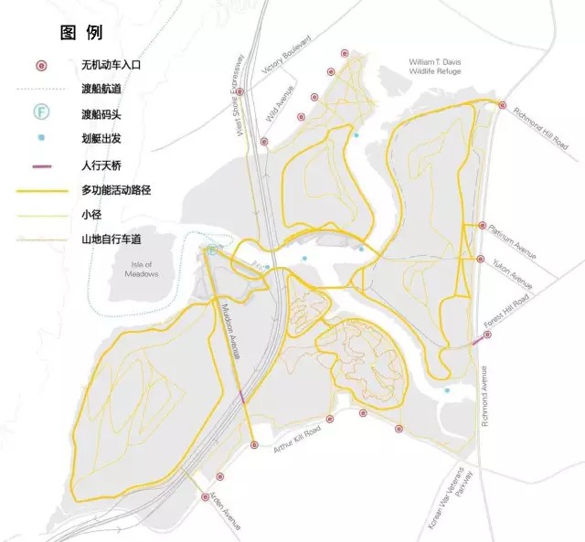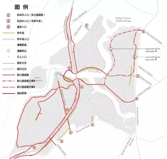 (5)在生態(tài)敏感度允許條件下優(yōu)化交通網(wǎng)絡(luò),提升公園在紐約市域及區(qū)域范圍內(nèi)的可達(dá)性;