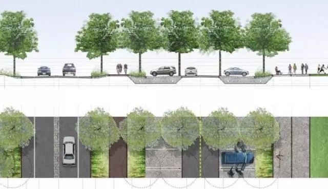 盡管公共交通是公園所在的斯塔滕島鼓勵(lì)發(fā)展的交通方式,但在以小汽車為主導(dǎo)的美國(guó)城市,短時(shí)間內(nèi)轉(zhuǎn)變主要交通方式的可行性較低。因此,公園規(guī)劃包含了適應(yīng)自然環(huán)境的停車設(shè)施規(guī)劃(圖9)。停車場(chǎng)分散于公園內(nèi)的各個(gè)主要片區(qū),掩映在線性栽植的樹(shù)蔭下,并與停車場(chǎng)周圍的自然環(huán)境相融合。停車場(chǎng)以可滲透性材料鋪設(shè),以減低熱島效應(yīng),并控制地表徑流(圖10)。