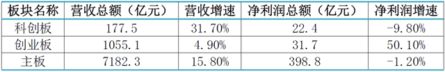 分板塊來看,科創(chuàng)板21家上市公司實(shí)現(xiàn)營收總額177.5億元,同比增長31.7%,實(shí)現(xiàn)凈利潤總額22.4億元,同比下降9.8%;創(chuàng)業(yè)板63家上市公司實(shí)現(xiàn)營收總額1055.1億元,同比增長4.9%,實(shí)現(xiàn)凈利潤總額31.7億元,同比增長50.1%;主板93家上市公司實(shí)現(xiàn)營收總額7182.3億元,同比增長15.8%,實(shí)現(xiàn)凈利潤總額398.8億元,同比下降1.2%。