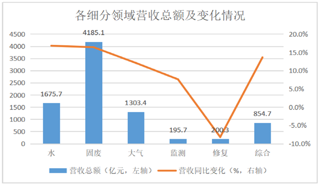 各細(xì)分領(lǐng)域業(yè)績情況出現(xiàn)分化。177家A股環(huán)保上市公司中,固廢、水務(wù)領(lǐng)域營收總額增長均超15%,修復(fù)領(lǐng)域營收總額下降。