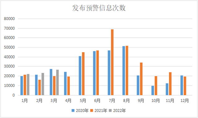依照《國(guó)家突發(fā)事件預(yù)警信息發(fā)布情況月報(bào)》,綜合對(duì)比2020年1月——2022年3月數(shù)據(jù)信息可知,全國(guó)各部門(mén)通過(guò)國(guó)家預(yù)警發(fā)布系統(tǒng)發(fā)布預(yù)警信息高點(diǎn)主要集中在5月——8月,表明夏季污染率更高;研究表明夏季的陽(yáng)光輻射致使臭氧常成為多地居高不下的首要污染物。