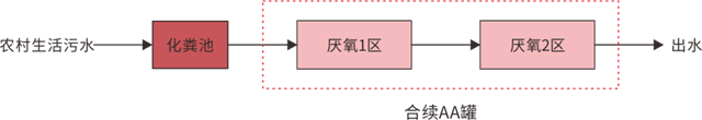 生活污水經農戶管網(wǎng)收集后首先進入化糞池單元,后流至AA罐分戶污水處理設備內,從厭氧1區(qū)到厭氧2區(qū)。