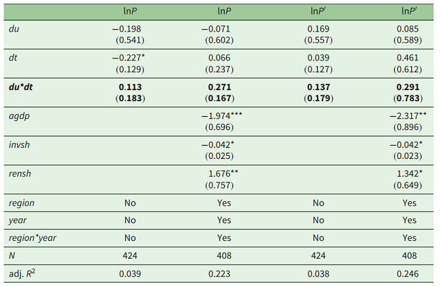 表1顯示了基準(zhǔn)回歸結(jié)果??梢钥闯龊诵淖兞縟u*dt的估計系數(shù)在統(tǒng)計上不顯著,結(jié)果無法表明地方環(huán)境立法有助于減少污染物排放。作者將污染物排放水平的對數(shù)值作為因變量,對模型進(jìn)行重新估計后,結(jié)果仍然沒有發(fā)現(xiàn)環(huán)境立法具有顯著影響。為進(jìn)一步驗證基準(zhǔn)回歸的準(zhǔn)確性,作者使用了不同的匹配標(biāo)準(zhǔn)作為穩(wěn)健性檢驗。首先,由于最近鄰匹配不止一次地使用一些未處理的省份作為匹配的比較組,所以作者考慮一個沒有替換的新匹配。換句話說,即每一個未經(jīng)處理的省份在某一年只使用一次。第二,由于最近鄰匹配對于每個處理過的省僅使用一個未處理組,所以作者也開始考慮在匹配分析中使用一個以上的比較省份。此外,作者采使用許多未處理省份的加權(quán)平均值(取決于核函數(shù)的選擇)作為研究的比較組。結(jié)果表明,所有上述穩(wěn)健性檢查未能支持地方立法的監(jiān)管效果,這證實了文中在基線DID回歸中的主要發(fā)現(xiàn)的有效性。