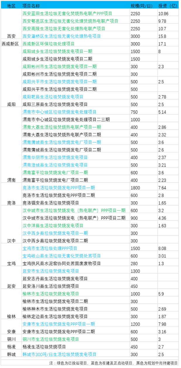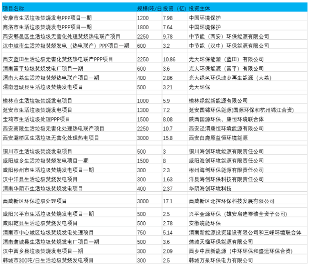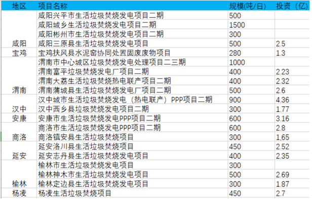 另外網(wǎng)上可查的已經(jīng)開(kāi)始招標(biāo)以及建設(shè)過(guò)程中的項(xiàng)目有14個(gè),總投資金額73.9億元,日處理規(guī)模超過(guò)1.3萬(wàn)多噸。其中西安灞橋區(qū)生活垃圾無(wú)害化處理熱電項(xiàng)目規(guī)劃日處理3000噸,與西咸新區(qū)項(xiàng)目并列為陜西最大規(guī)模的生活垃圾焚燒項(xiàng)目,其中一期750噸去年底已經(jīng)點(diǎn)火試運(yùn)行。真正投運(yùn)后,即使不包含西咸新區(qū),西安市的日垃圾焚燒規(guī)模也將超過(guò)一萬(wàn)噸。另外商洛市生活垃圾焚燒發(fā)電PPP項(xiàng)目、寶雞市生活垃圾處理PPP項(xiàng)目、延安市生活垃圾焚燒發(fā)電項(xiàng)目規(guī)劃日處理規(guī)模均超過(guò)千噸。如下圖﹕