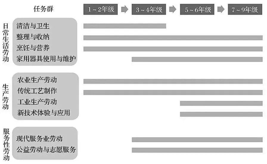 生產(chǎn)勞動:農(nóng)業(yè)生產(chǎn)勞動、傳統(tǒng)工藝制作、工業(yè)生產(chǎn)勞動、新技術(shù)體驗與應用四個任務群。