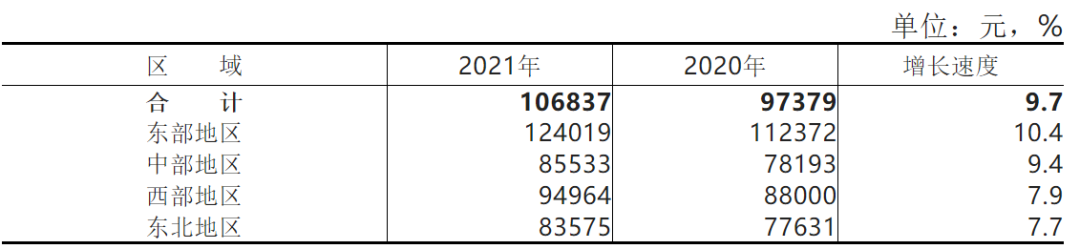 分區(qū)域看,東部地區(qū)年平均工資和增速均最高,年平均工資為124019元,同比增長(zhǎng)10.4%,增速比2020年提高了2.4個(gè)百分點(diǎn);中部地區(qū)年平均工資為85533元,同比增長(zhǎng)9.4%,增速比2020年提高了3.0個(gè)百分點(diǎn);西部地區(qū)年平均工資為94964元,同比增長(zhǎng)7.9%,增速比2020年提高了0.5個(gè)百分點(diǎn);東北地區(qū)年平均工資為83575元,同比增長(zhǎng)7.7%,增速比2020年下降了0.5個(gè)百分點(diǎn)。最高和最低地區(qū)的平均工資之比為1.48,比上年擴(kuò)大0.03。