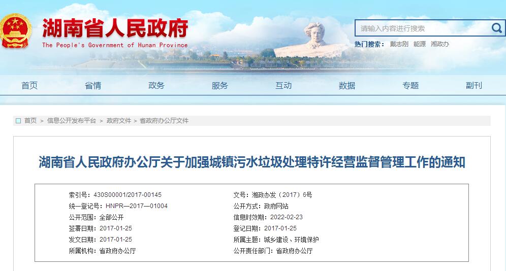 湖南省人民政府辦公廳關(guān)于加強城鎮(zhèn)污水垃圾處理特許經(jīng)營監(jiān)督管理工作的通知