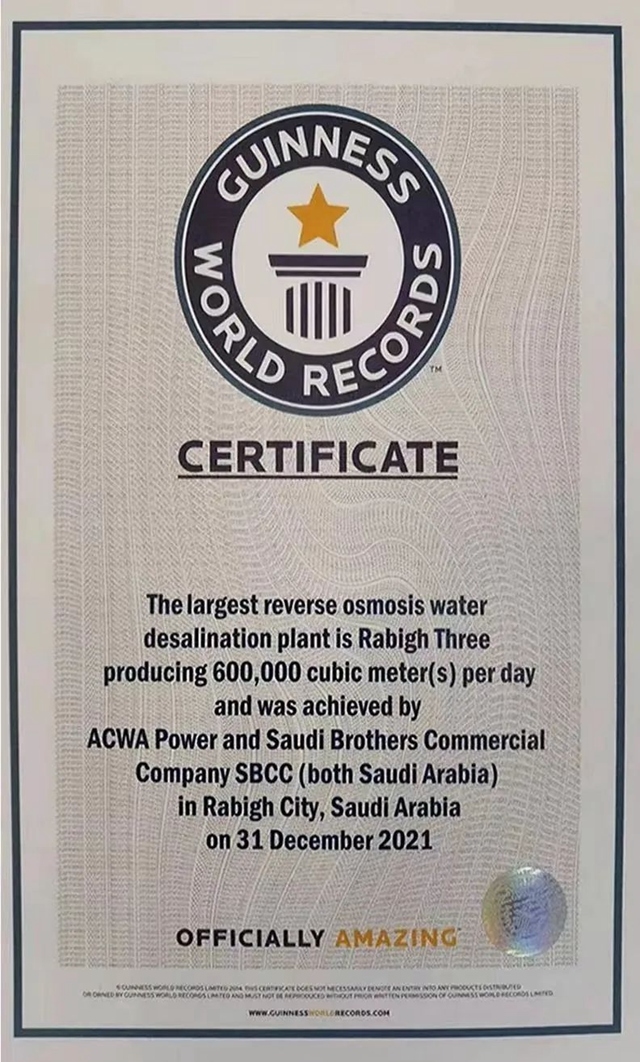 該項(xiàng)目位于沙特拉比格市,于去年12月,提前合同工期2個月投產(chǎn)。采用先進(jìn)的反滲透技術(shù),日產(chǎn)水量60萬立方米,每天可向吉達(dá)、麥加等沙特主要城市200多萬戶居民和朝圣者提供基本生活用水,甘甜的淡水不僅滋養(yǎng)了穆斯林圣地,還促進(jìn)了社會和旅游業(yè)發(fā)展。就在前不久,它還收到吉尼斯世界紀(jì)錄證書,成為世界最大單體反滲透海水淡化項(xiàng)目。