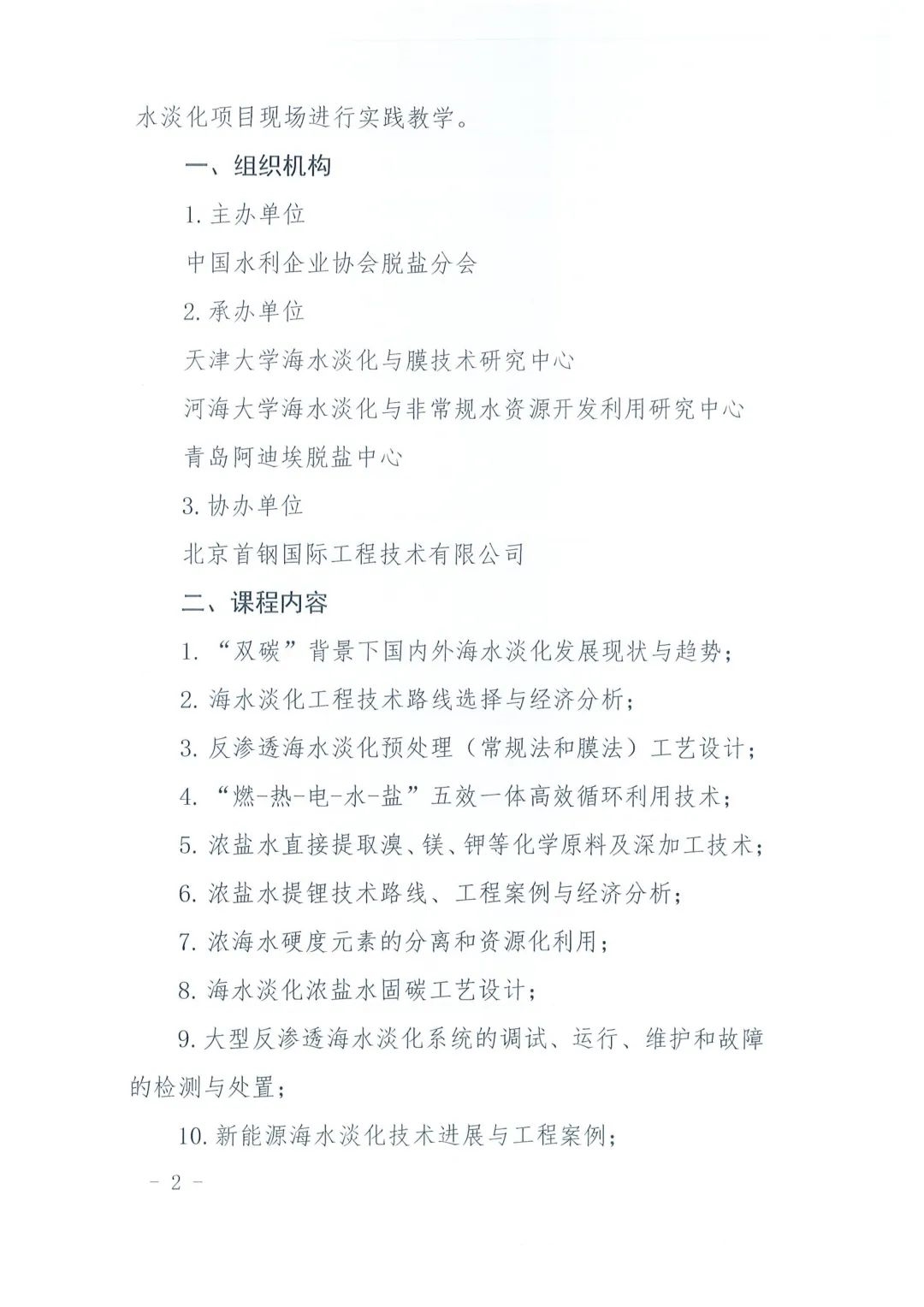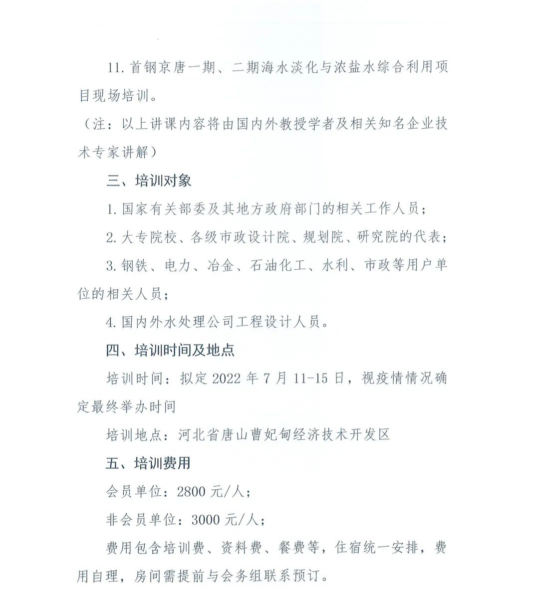 為了貫徹落實《海水淡化利用發(fā)展行動計劃(2021—2025年)》,推動“雙碳”背景下的海水淡化與濃鹽水綜合利用,由中國水利企業(yè)協(xié)會脫鹽分會主辦的第十一屆海水淡化工程與技術培訓班計劃于2022年7月11日至15日在河北省唐山市曹妃甸區(qū)舉辦,本屆海水淡化培訓班的主題是“綠色低碳”海水淡化與濃鹽水綜合利用,課程內容豐富充實,教學質量專業(yè)。此次培訓以理論結合實踐的教學方法,結合首鋼京唐公司“燃-熱-電-水-鹽”五效一體高效循環(huán)利用技術現(xiàn)場進行實踐教學。