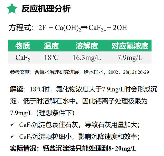 傳統(tǒng)的鈣鹽(石灰)沉淀法除氟在機(jī)理上不能滿(mǎn)足當(dāng)下的要求(如下圖),其最多只能將氟化物處理到8~20mg/L。污水廠(chǎng)的嚴(yán)格排放,倒逼企業(yè)深度治理,迫在眉睫。