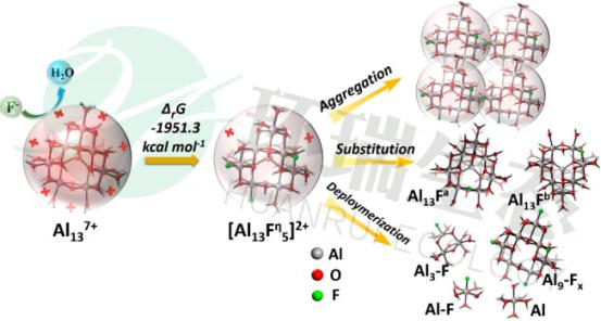 其中“氟凈”系列除氟劑,除氟功能單元含量比市面同類(lèi)型產(chǎn)品高出20-50%,且主要為經(jīng)特殊設(shè)計(jì)的Al13結(jié)構(gòu)。其主要微觀機(jī)理如下所示,Al13結(jié)構(gòu)使得大量的氟離子能夠與OH-實(shí)現(xiàn)交換,去除同樣量的氟化物,用量更少。