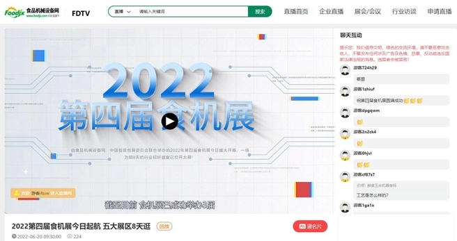 6月20日上午9:30,由中國(guó)智能包裝委員會(huì)與食品機(jī)械設(shè)備網(wǎng)聯(lián)合舉辦的“2022食機(jī)展——食品機(jī)械設(shè)備網(wǎng)線上展會(huì)(第4屆)”正式拉開(kāi)帷幕。本屆食機(jī)展為期8天(6月20日—6月28日),設(shè)有烘焙設(shè)備、包裝設(shè)備、果蔬機(jī)械、肉類(lèi)深加工設(shè)備、食品配套設(shè)備5大展館,通過(guò)靈活多樣、省時(shí)省力、便捷高效的參展與逛展方式,力爭(zhēng)為您帶來(lái)低成本、高效率的食品機(jī)械線上采供交流,足不出戶就能成就雙方互利共贏。