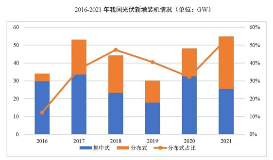 2021年,我國光伏新增裝機量、分布式裝機量、戶用裝機量以及分布式裝機在總裝機量中的占比均創(chuàng)歷史新高。我國光伏新增裝機54.88GW,同比增長13.9%,其中,分布式裝機約29.28GW,占全部新增裝機的53.4%,歷史上首次突破50%。2021年戶用裝機達(dá)21.6GW,同比增長113.3%,占2021年我國新增光伏裝機的39.4%。光伏發(fā)電量3259億千瓦時,同比增長25.1%,全國利用小時數(shù)1163小時,同比增加3小時,光伏發(fā)電利用率98%,與上年基本持平,新疆、西藏等地光伏消納水平顯著提升,光伏利用率同比分別提升2.8%和5.6%。
