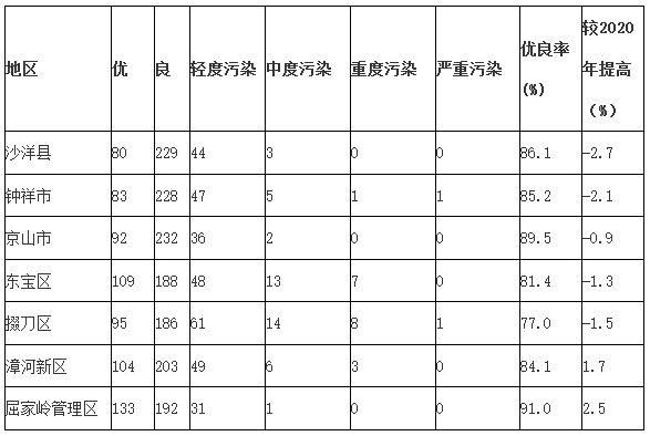 根據(jù)《中華人民共和國(guó)環(huán)境保護(hù)法》規(guī)定,現(xiàn)發(fā)布《2021年度荊門市生態(tài)環(huán)境狀況公報(bào)》。一、環(huán)境空氣質(zhì)量