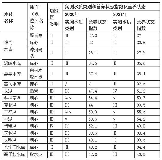 我市縣級(jí)以上集中式飲用水源地有6個(gè),分別為:市二水廠、市三水廠、漢江鐘祥皇莊段、惠亭水庫(kù)、八字門水庫(kù)(備用水源地)和漢江沙洋段。根據(jù)2021年監(jiān)測(cè)結(jié)果顯示,全市縣級(jí)以上集中式飲用水源地水質(zhì)達(dá)標(biāo)率為100 %。(具體達(dá)標(biāo)情況見表7)