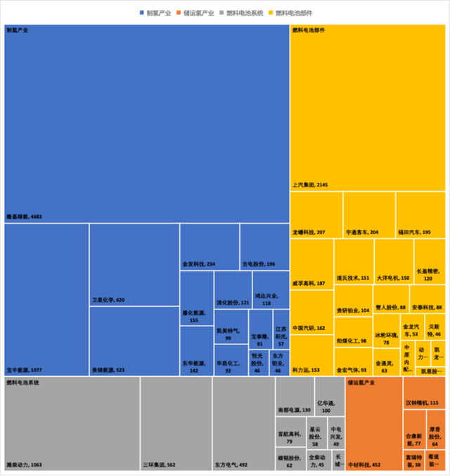 圖2 氫能產(chǎn)業(yè)鏈各上市公司市值 (億元)