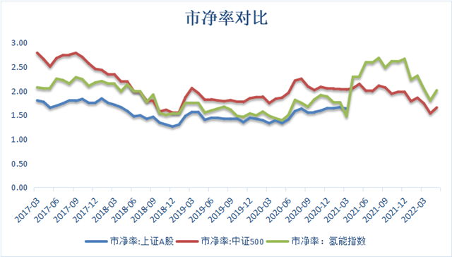 市凈率(圖5)是指每股股價與每股凈資產(chǎn)的比率,市凈率是評估一家上市公司的是否具備投資安全系數(shù)的核心財務(wù)指標(biāo),從2021年5月開始,氫能指數(shù)的市凈率遠超上證A股和中證500,說明相對于其他指數(shù)氫能指數(shù)是更安全的投資。