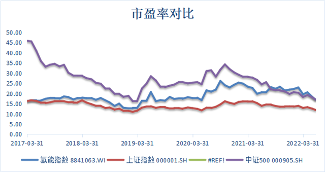 自2019年開始氫能首次被寫入政策,2020年一系列政策出臺大力推行氫能發(fā)展到寫入“十四五”規(guī)劃確定氫能源的戰(zhàn)略地位,氫能指數(shù)估值也隨著政策的一步步推動穩(wěn)步上升,基本超越大盤指數(shù)(圖4),其中2021年氫能指數(shù)攀升40%,超上證指數(shù)8倍,超深證成指13倍,超中證500指數(shù)2.6倍。2022年3月底國家能源局發(fā)布《氫能產(chǎn)業(yè)發(fā)展中長期規(guī)劃(2021-2035年)》氫能指數(shù)又開始波動上升,屢屢超過中證500、上證A股等指數(shù)。這說明了市場對利好信息的反應(yīng),資本市場對利好政策的敏感。