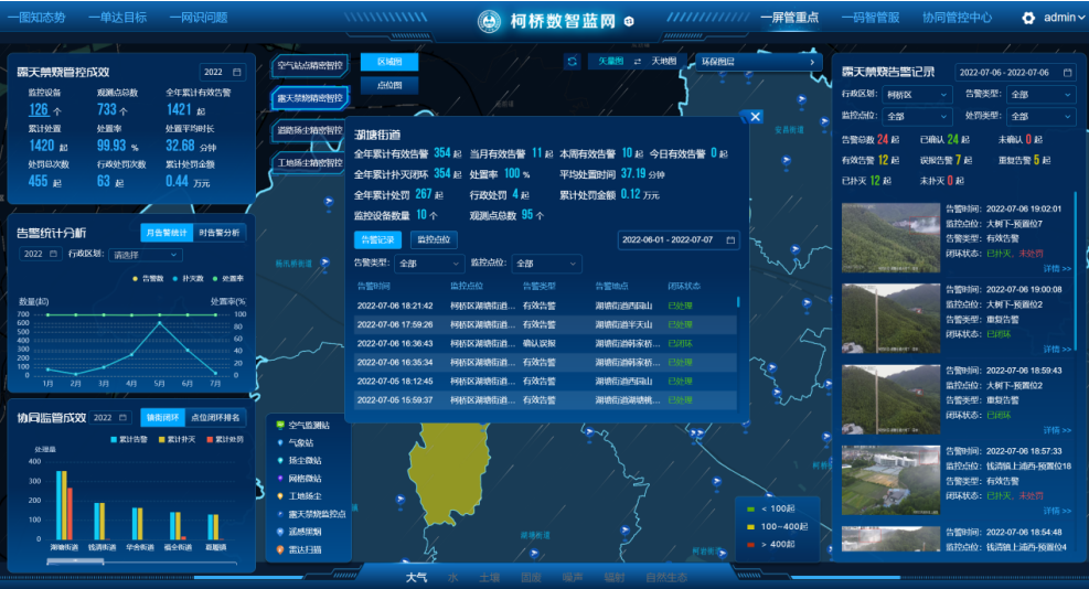 柯橋區(qū)整合6個區(qū)級部門、16個鎮(zhèn)街的120個高位監(jiān)控,覆蓋國控站點、高速高鐵、工業(yè)園區(qū)、平原山林、礦山工地等重點區(qū)域,共700余個多發(fā)預(yù)置監(jiān)測點統(tǒng)一納入平臺,實行24小時自動巡航監(jiān)管,對點位周邊3-5平方公里范圍內(nèi)的露天焚燒實現(xiàn)自動分析與抓拍。結(jié)合全區(qū)800余名網(wǎng)格員常態(tài)化巡查,實現(xiàn)“智防”+“人防”,做到露天焚燒行為精準(zhǔn)發(fā)現(xiàn)、快速處置。實現(xiàn)告警信息秒級推送、“遠中近”三圖精準(zhǔn)識別、“年月周日”分時段科學(xué)分析。