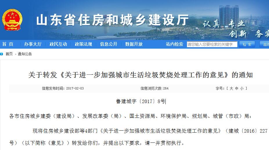 北極星節(jié)能環(huán)保網(wǎng)訊:北極星節(jié)能環(huán)保網(wǎng)獲悉,近日山東省住房和城鄉(xiāng)建設(shè)廳、山東省住房和城鄉(xiāng)建設(shè)廳、山東省發(fā)展和改革委員會(huì)以及山東省國(guó)土資源廳山東省環(huán)境保護(hù)廳聯(lián)合發(fā)布關(guān)于轉(zhuǎn)發(fā)《關(guān)于進(jìn)一步加強(qiáng)城市生活垃圾焚燒處理工作的意見(jiàn)》的通知,通知提到,原則上,全省新上城市生活垃圾處理項(xiàng)目,要一律選擇焚燒(發(fā)電)處理技術(shù),現(xiàn)有生活垃圾處理設(shè)施預(yù)期使用年限小于5年的市、縣,要立即啟動(dòng)生活垃圾焚燒處理設(shè)施項(xiàng)目選址、環(huán)評(píng)、立項(xiàng)、土地征用、規(guī)劃等前期工作,條件成熟的盡快開工建設(shè)。