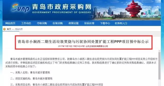 11月16日,據(jù)青島市公共資源交易中心消息,青島市小澗西二期生活垃圾焚燒與污泥協(xié)同處置擴能工程PPP項目已公布預(yù)中標公示,上海康恒環(huán)境股份有限公司為預(yù)成交供應(yīng)商。