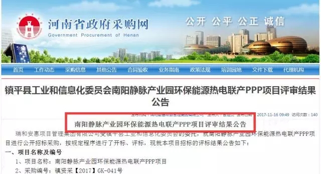 河南省政府采購網(wǎng)16日發(fā)布南陽靜脈產(chǎn)業(yè)園環(huán)保能源熱電聯(lián)產(chǎn)PPP項目評審結(jié)果公告,第一中標候選人為上??岛悱h(huán)境股份有限公司。