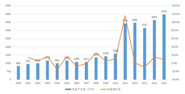 根據(jù)環(huán)保部公布的各年度環(huán)境統(tǒng)計(jì)年報(bào),我國(guó)工業(yè)危險(xiǎn)廢物年產(chǎn)生量處于上下小幅波動(dòng)、整體逐步遞增的狀態(tài)。據(jù)統(tǒng)計(jì),2015年我國(guó)危險(xiǎn)廢物的產(chǎn)生量為3976.1萬(wàn)噸。